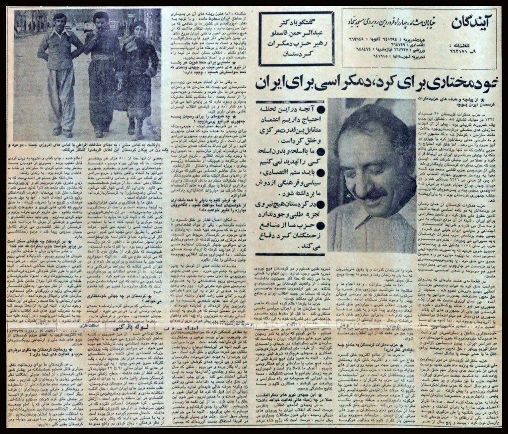 ـ «عبدالرحمن قاسملو، رهبر حزب دموکراتیک کردستان، دیروز هرگونه اتهام جداییطلبی را رد کرد و پشتیبانی کامل خود را از آیتالله خمینی و دولت انقلابی بازرگان اعلام داشت… قاسملو همچنین گفت: شایعات مبنیبر اغتشاشات متعدد در کردستان کذب است… من شایعه صدای رادیوی کردستان آزاد را تکذیب میکنم. این شایعات را فقط دیوانهگان میسازند.»