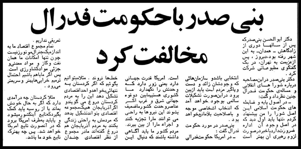ـ ابوالحسن بنیصدر در مصاحبهای با نماینده خبرگزاری پارس در همدان با طرح این موضوع که کردستان نمیتواند به تنهایی یک واحد اقتصادی باشد اظهار داشت: «حکومت فدرالی عملی نیست… مثلاً کردستان چه درآمدی دارد، اگر به حال خودش بماند یا از روسیه باید کمک بگیرد که تابع این کشور میشود و یا باید به طرف امریکا برود که در آن صورت تابع آمریکا خواهد شد. پس چه بهتر که تابع خود ما باشد.»