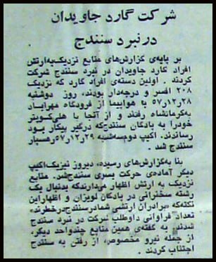 … روز گذشته [28 اسفند] از ساعت 5/6 صبح هواپیماهای فانتوم بر فراز سنندج به پرواز درآمدند که در اثر آن شهر در وحشت فرو رفت و به دنبال آن همۀ مغازههای شهر، حتی نانواییها، تعطیل کردند. افزون بر این چهار هلیکوپتر که بر فراز شهر به پرواز درآمده بودند، مردم را به گلوله بستند و به سوی خانهها و مراکزی که مردم مسلح بودند، نارنجک پرتاب کردند.